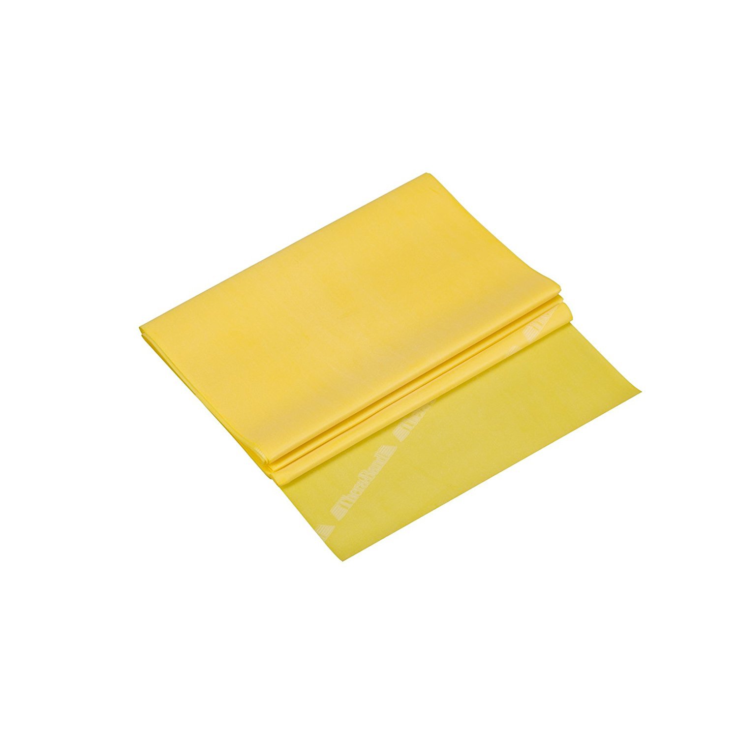 • Thin Yellow Bands are the 2nd of 8 resistance levels, perfect for rehabilitation or beginners. They offer 3.0 lbs. resistance at 100% elongation, a 25% increase from the previous color, and 4.3 lbs. at 200%. The band measures 5 feet long x 5" wide